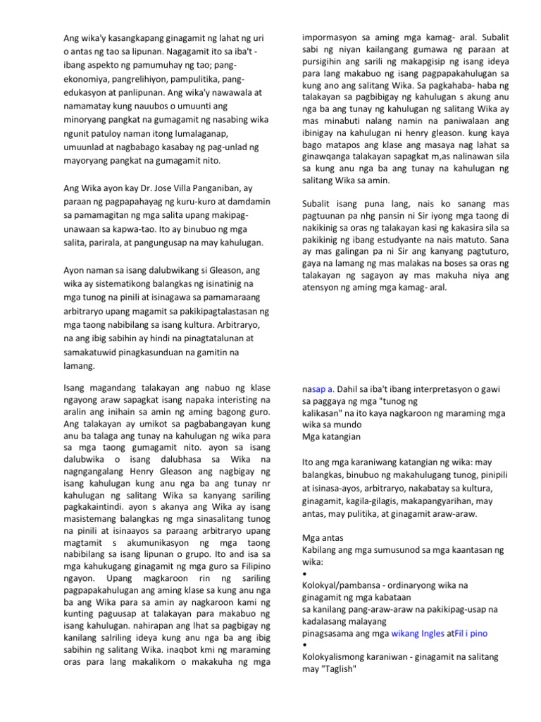 Ibat ibang uri ng wika. Kung babalikan ang kahulugan ng wika ayon kay Henry Gleason nakapaloob sa kahulugang kaniyang ibinigay ang tatIong katangian ng wika. Pambansa- ito ay wikang ginagamit at mauunawaan sa buong bansa halimbawa nito ay.