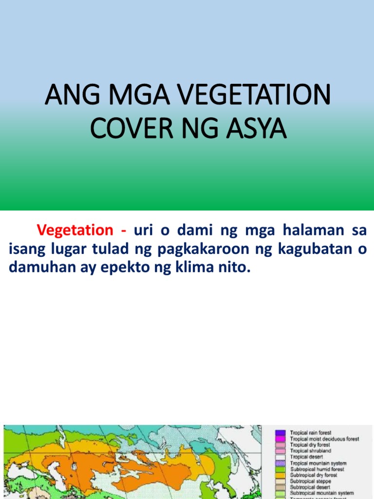 Sa paanong paraan nakaaapekto ang klima at vegetation cover sa aspektong kultural at pangkabuhayan ng mga Asyano. Bakit iba-iba ang vegetation cover o behetasyon sa ibat-ibang bahagi ng Asya. Ano-anung ang dahilan kung bakit iba-iba ang vegetation cover at klima ng asya.